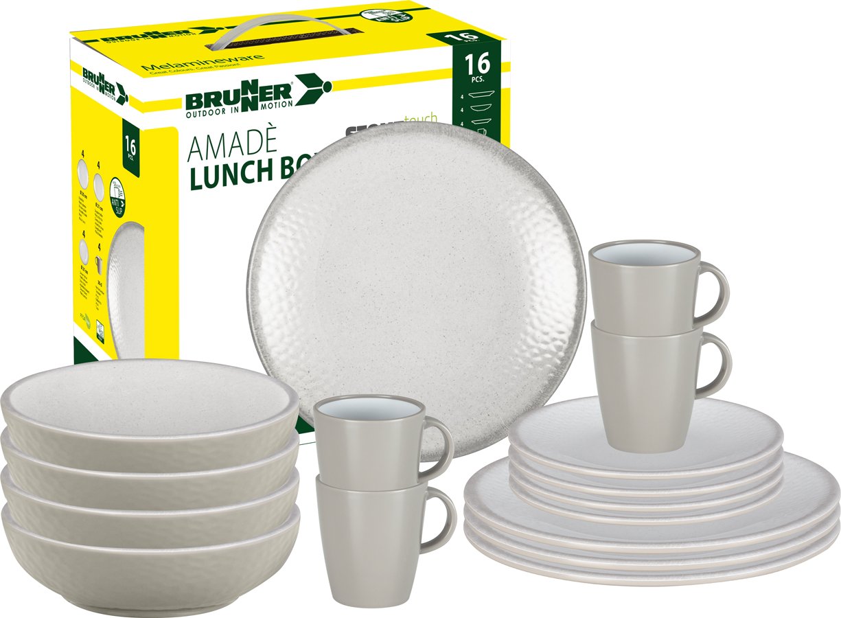 Odličen melaminski set Amade iz novega “Stone Touch” melaminskega materiala. Servis ima tudi Anti-slip podlogo – dodatna guma proti drsenju krožnikov in skodelic.