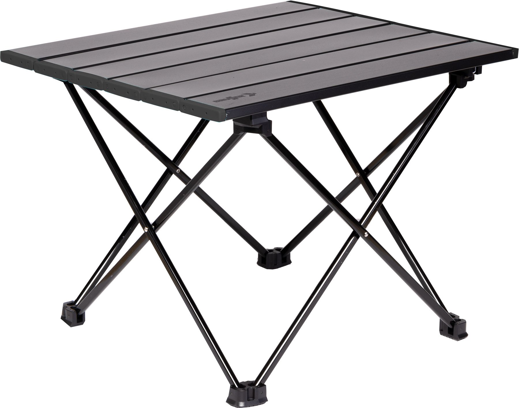 Kompaktna stranska mizica s stabilno “rollable” ploščo iz barvanega aluminija. Zložljiv jeklen okvir. Priložena torba.