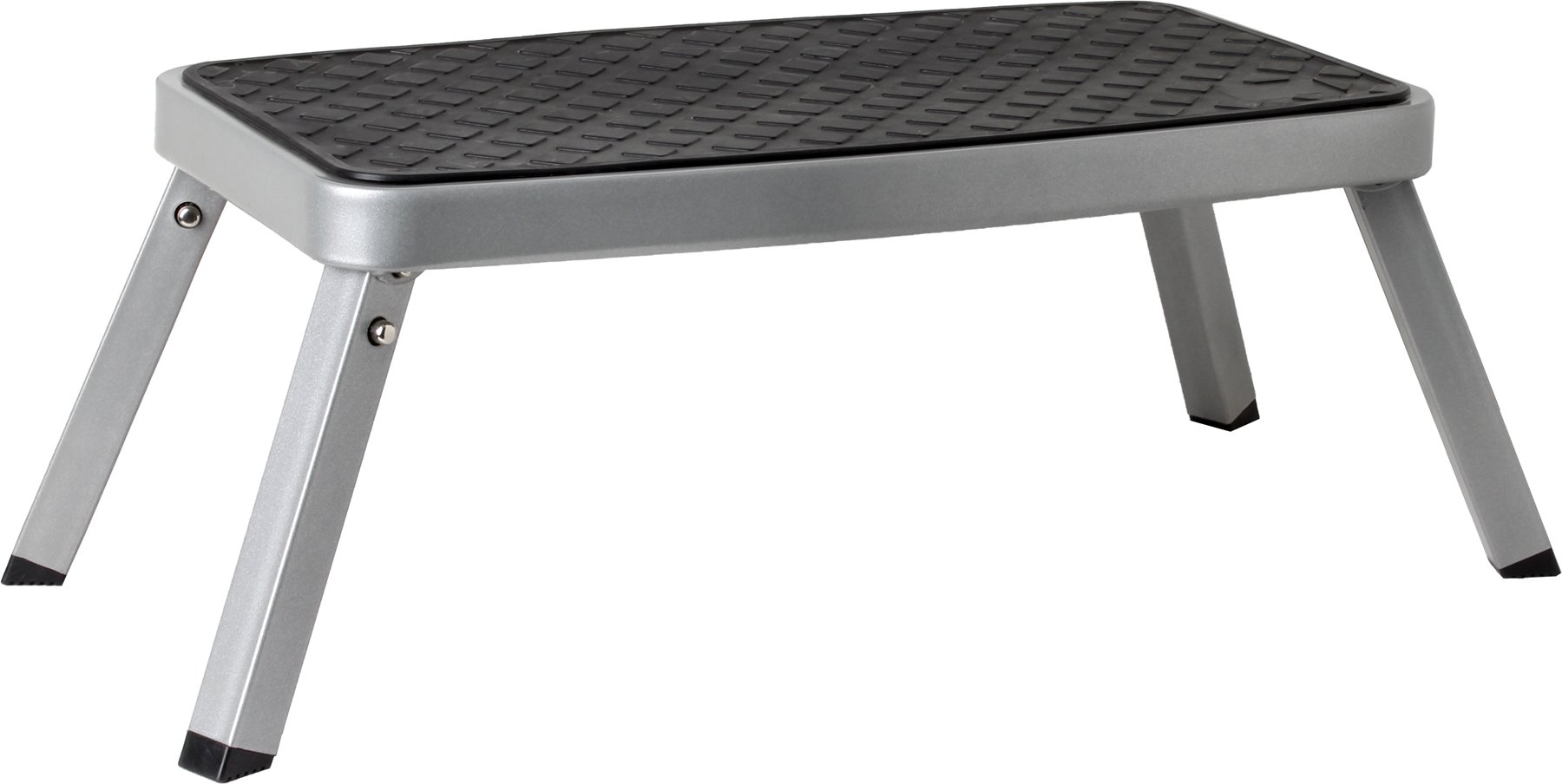 Čvrsta zložljiva stopnica z nosilnostjo 150 kilogramov. Kovinska konstrukcija in gumirana zgornja površina.