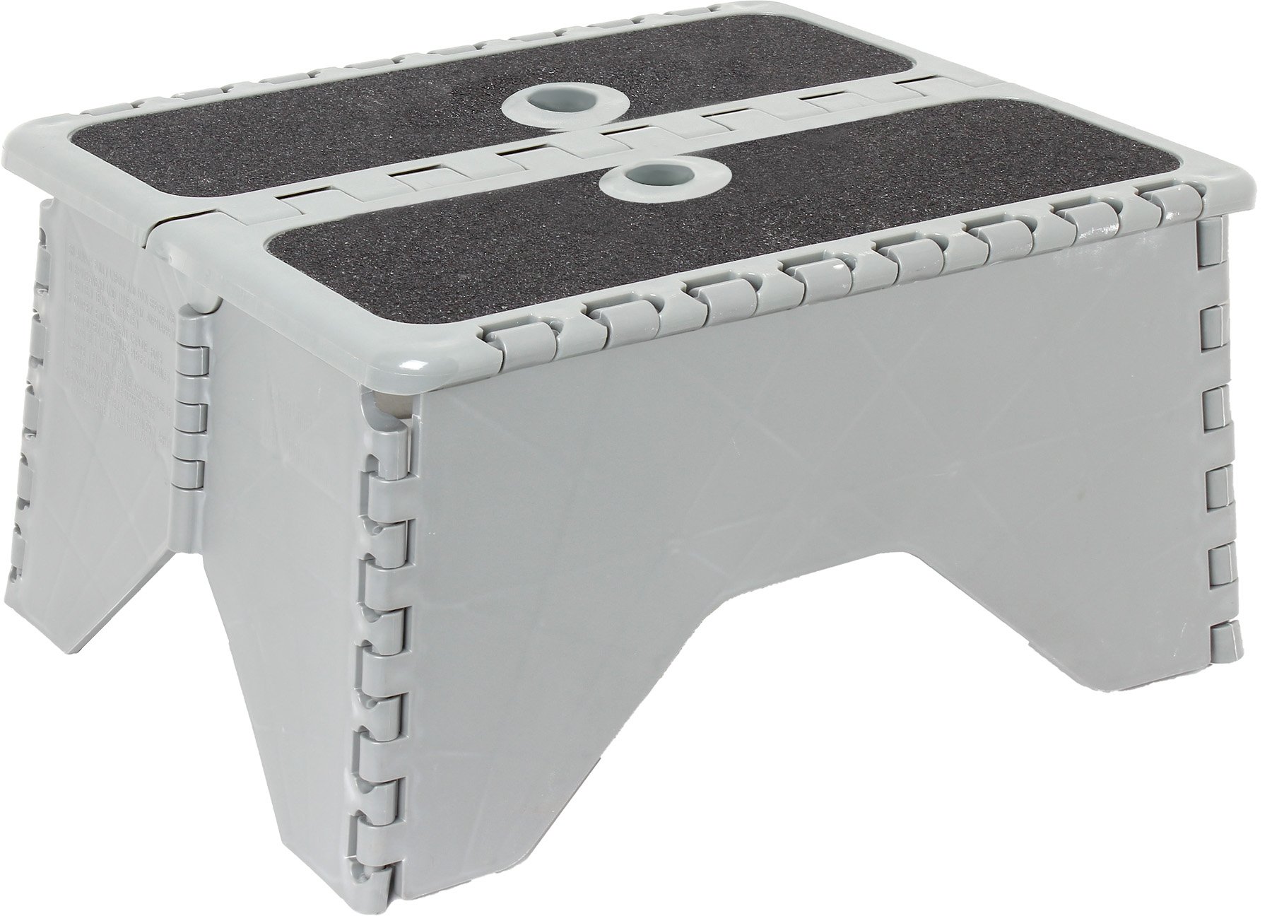 Kompaktno sklopivo stubište za kamp prikolice, kampove i kućanstvo dostupno je u kombinaciji svijetlo sive boje sa tamnim protukliznim dijelovima.